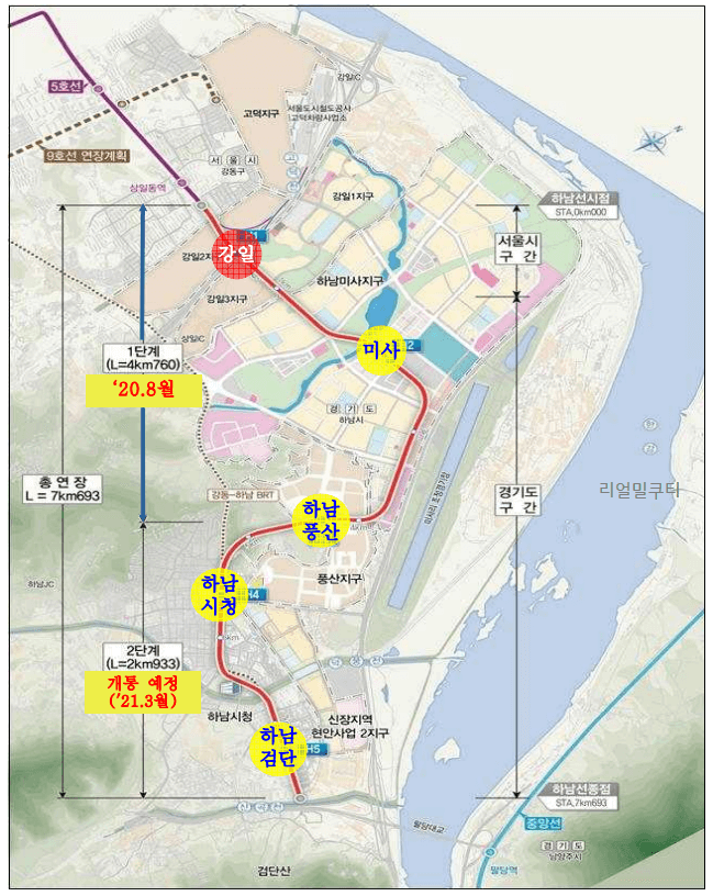 [지하철 5호선 연장 하남선 복선절철 노선도]