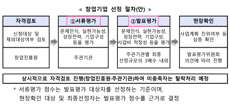 - 제품 및 서비스 개발 동기, 개발방안, 시장진입 및 성과 창출 전략, 창업기업 대표자 및 팀원의 연락 등을 종합적으로 평가 (주관기관에서 지정하는 온라인 플랫폼으로 온라인 평가로 운영 가능)