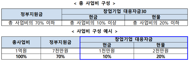 ◇ 총 사업(100%)의 구성은 정부지원금 70% 이하 + 창업기업 대응자금 30% 이상입니다.