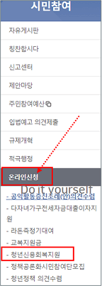 시민참여 그림 아래로 온라인 신청을 찾고 세부항목으로 [청년 신용회복지원]을 선택합니다.