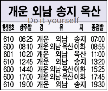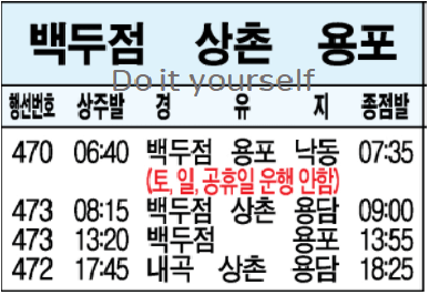 - 모동, 신흥, 정양, 오도리, 보덕암, 솔미, 이동3리(일요일은 운행되지 않음)