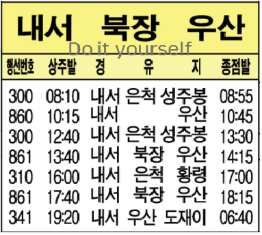 - 경유지: (외서-은척-압실), (외서-우산-북장), (외서-우산-도재이)
