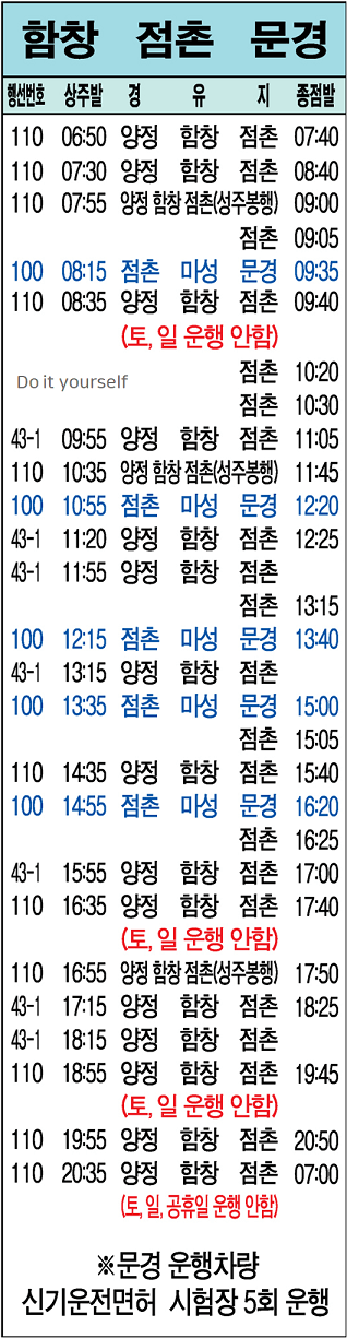 - 이안1리, 이안2리, 가장, 소암, 함창, 나한사, 지산2리, 함창, 점촌 (금요일은 운행되지 않음)