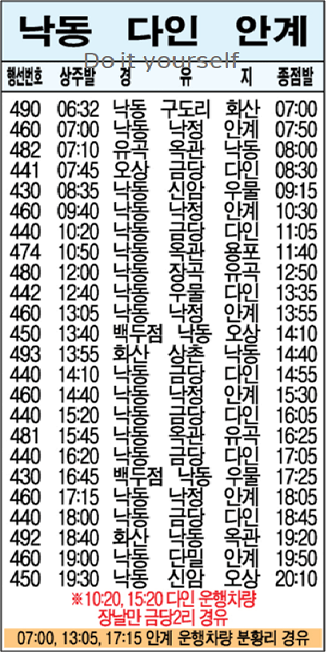 ※7:00, 13:05, 17:15 안계 운행차량 분황리 경유 (연장)