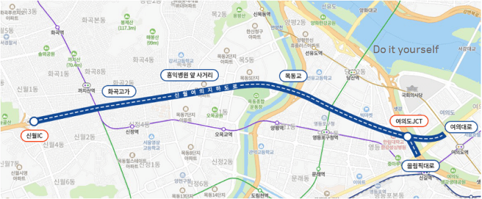 신월여의지하도로 지상부로는 신월나들목~목동종합운동장을 연결하는 왕복 4차로가 조성될 예정이라고 합니다.
