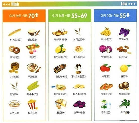GI수가 높으면 높아질수록 상대적으로 혈당을 빨리 더 많이 올린다고 볼 수 있습니다.