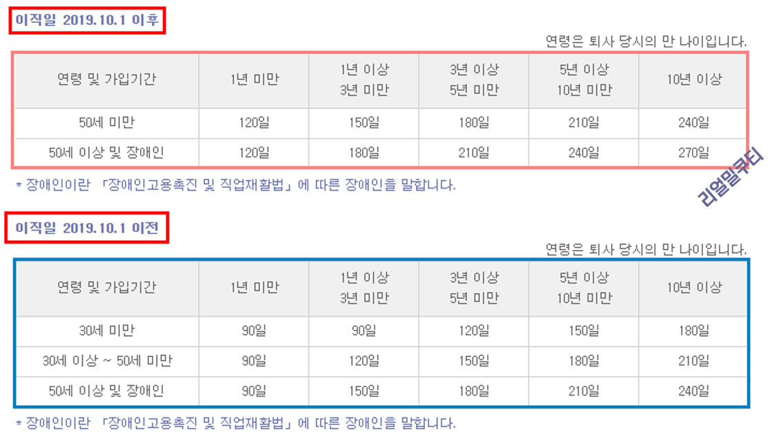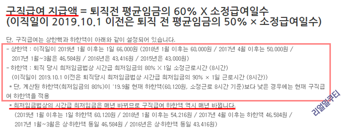구직급여 or 실업급여의 급여일수, 연령 및 지급액은 이직일 2019.10.1 이전/이후로 개정된 부분이 있으니,