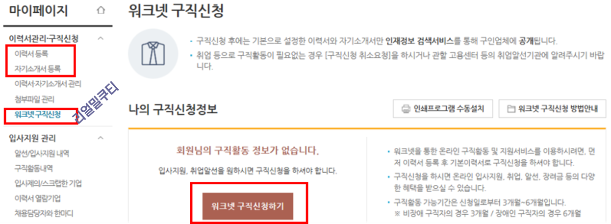 또는 마이페이지 -> 워크넷 구직신청 클릭