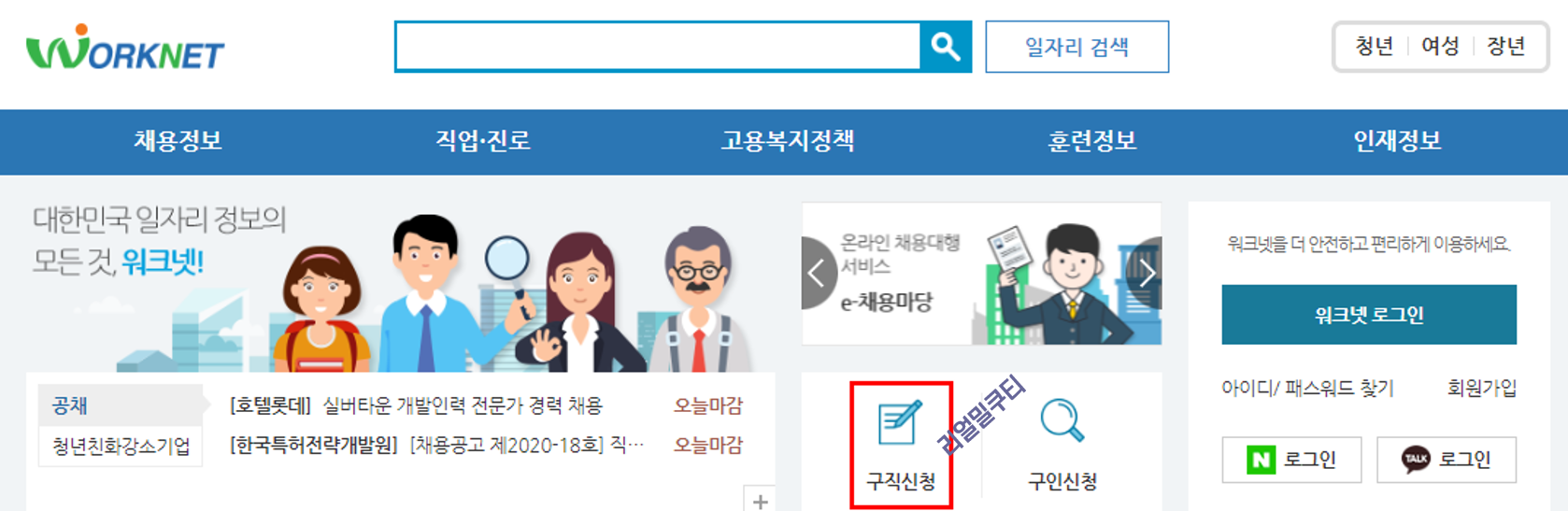위 그림의 구직신청을 눌러주세요.