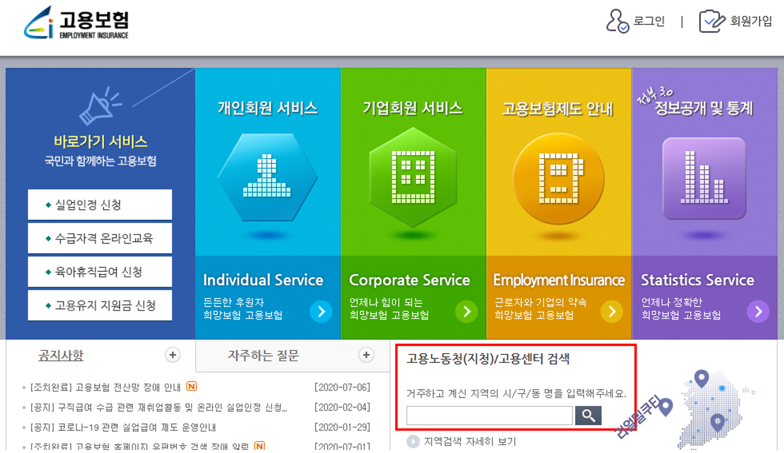 고용센터 홈페이지 메인에 고용센터 검색이 있어요.