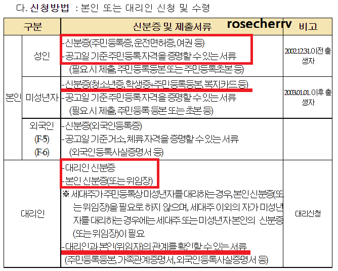 - 신청 준비물: 다음 그림과 같으며 성인의 경우 신분증+주민등록등초본