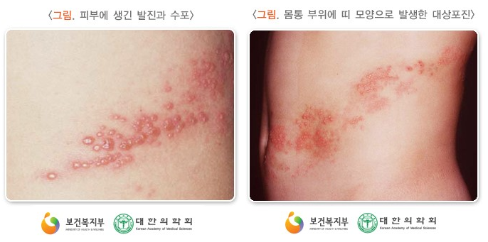 붉은 발진 -> 띠 형태의 물집 -> 고름물집 -> 딱지로 진행됩니다.