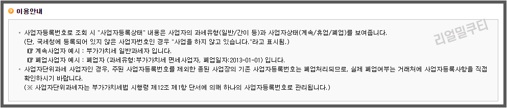 주의사항으로는 이 정보는 홈택스에서 세무처리시 불의의 피해를 받지 않도록 하기 위해서 납세자가 확인할 수 있도록 최소한의 정보를 제공하는 것이라고 해요. 따라서 이 자료는 증빙자료로 제출할 수 없으며 법적인 효력이 없다고 해요. 만약 조회했을 때 폐업이라고 조회된다면 실제 거래처에 상황을 확인하는 것도 방법이 되겠습니다.