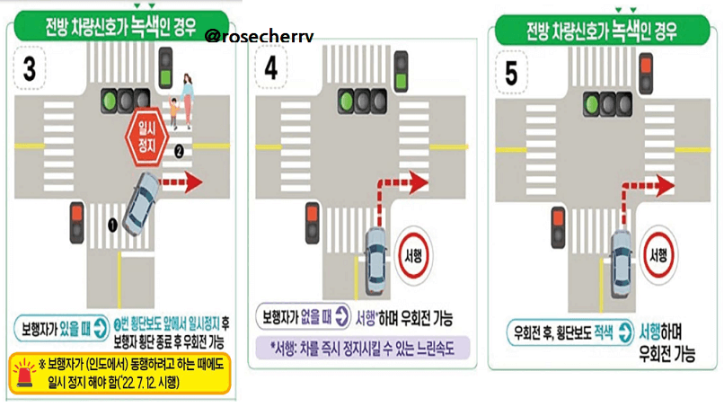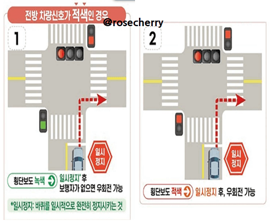 1) 횡단보도: 녹색 -> 일시정지* 후 우회전 가능