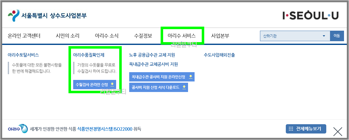 왼쪽에서 두번째에 아리수 품질 확인제가 있죠? 수질검사 온라인 신청 버튼이 있습니다!