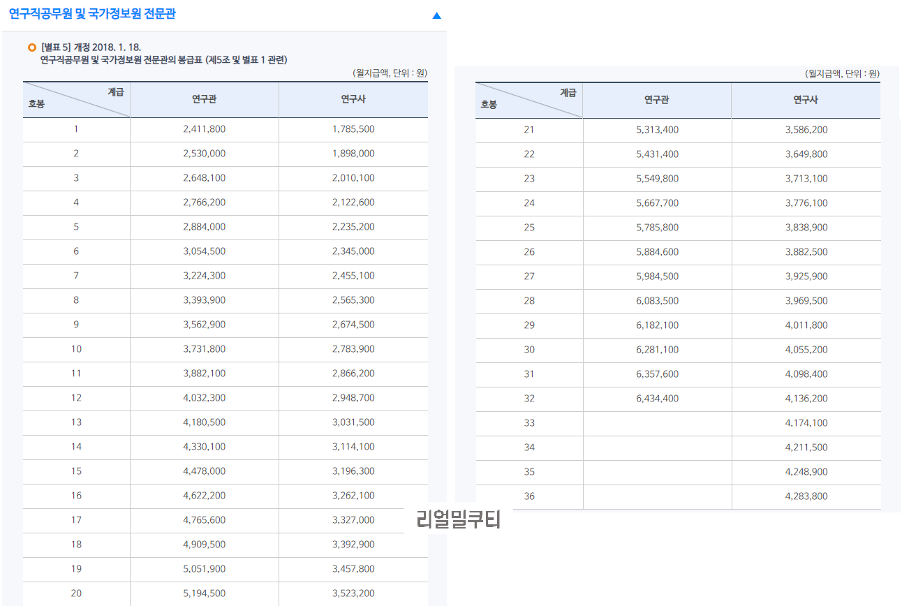 정부 인사혁신처에서는 공무원의 보수규정에 따른 직종별 봉급표를 공개하고 있습니다. 여기에서는 연구직 공무원과 국가정보원 전문관의 봉급에 대해 알아보겠습니다.