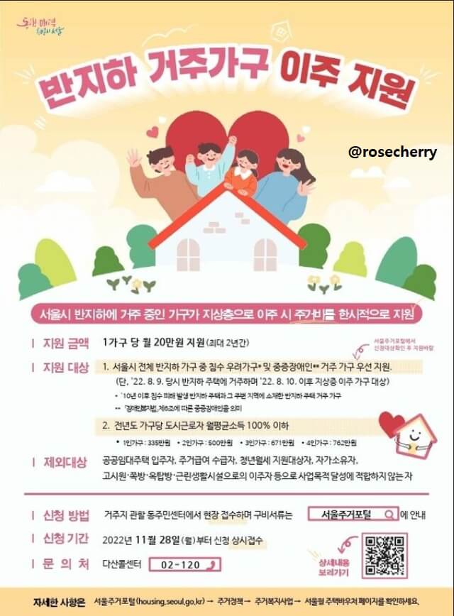 서울시 반지하 가구중 침수우려가 있거나 거주중인 가구가 지상층으로 이사할 경우 주거비를 지원하는 제도입니다.