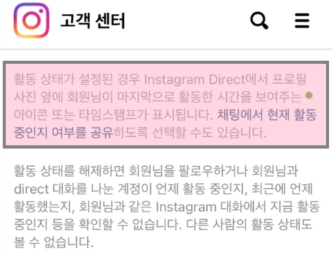 활동상태 해제시: 팔로우하는 사람, 나와 다이렉트 대화를 나눈 계정이 언제 활동 중인지, 최근에 언제 활동했는지, 나와 같은 인스타 대화에서 지금 활동 중인지 등을 확인할 수 없게 된다. 나는 물론 다른사람의 활동 상태도 볼 수 없게된다.