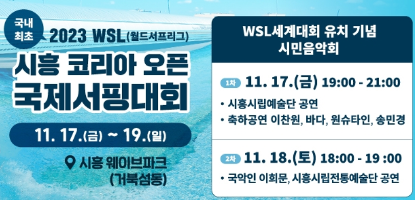 서퍼들이라면 알아야하는! 국내 최초 처음 열리는 세계 최초 인공풀 대회 QS3000, LQS <2023 WSL 시흥코리아 오픈 국제 서핑대회>를 소개해드리겠습니다! : ) 이 대회에는 음악회, 버스킹, 플리마켓 등 연계 행사도 열린다고 해요. 특히 11월 17일과 18일에는 축하공연도 함께하는데요! 하나씩 알아볼께요!