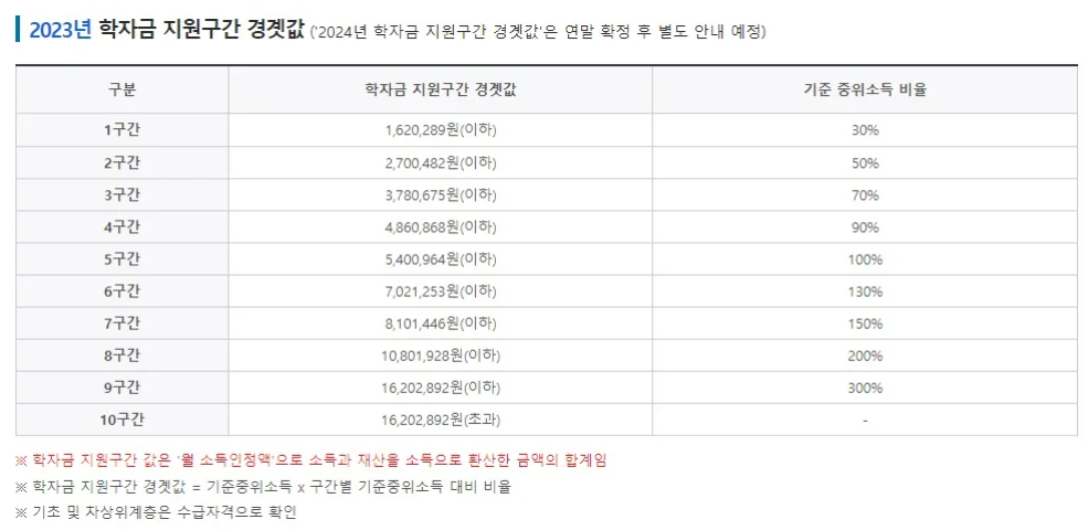 ▼2023년 학자금 지원구간 경곗값이며 2024년 학자금 지원구간 경곗값은 연말에 확정된다고 합니다.
