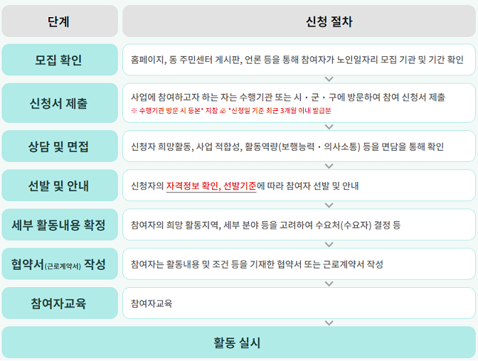 - 위의 일자리 채용공고, 동 주민센터 게시판 등을 통해 참여자가 노인일자리 모집기관 및 기간을 확인하십니다. - 신청서 제출