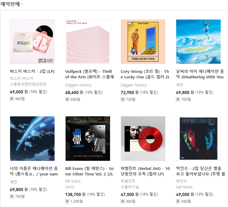 예약판매되는 LP 리스트를 보니, 대략 4만 9천원에서 7만 3천원까지 있네요.