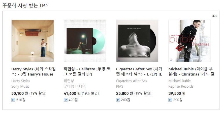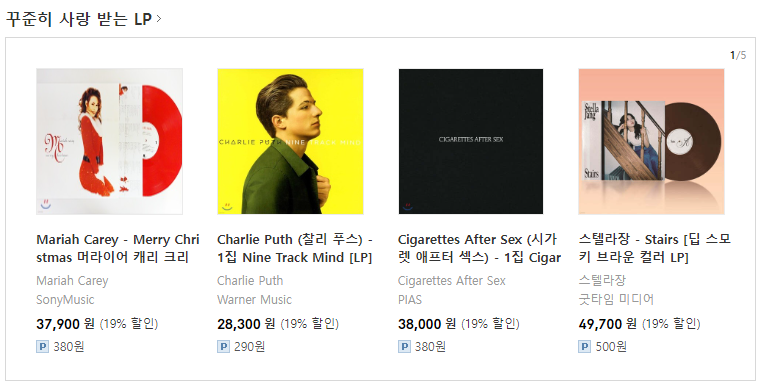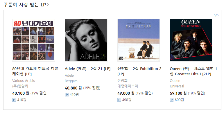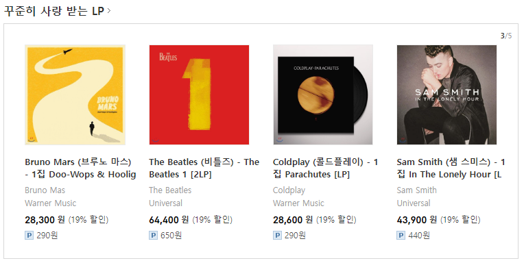꾸준히 사랑 받는 LP 리스트를 보니, 대략 2만 8천원에서 6만 4천원까지 있네요.