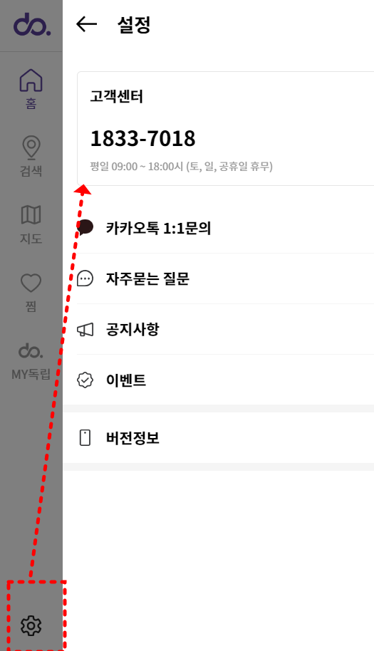설정버튼을 누르면 고객센터 전화번호, 카카오톡 1:1문의, 자주묻는질문, 공지사항, 이벤트 등을 확인할 수 있다.