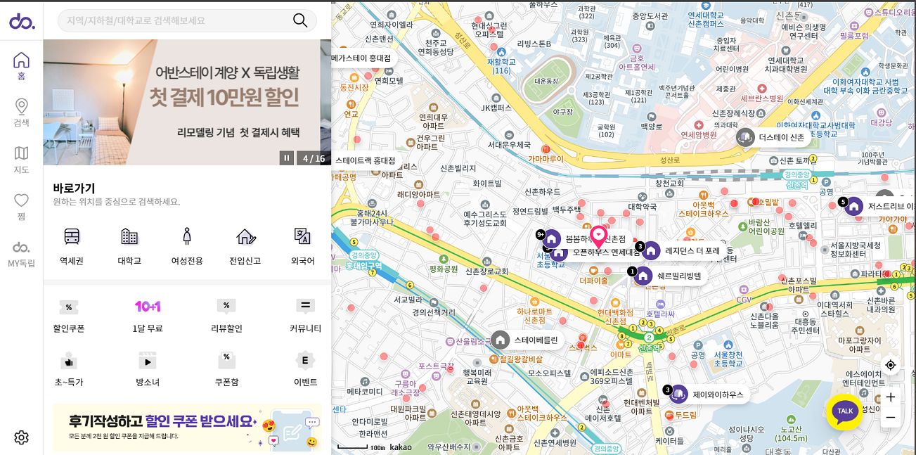 '보증금 없이 월단위로 거주할 수 있는 고시원을 찾는 사람들에게 저렴한 생활공간을 원스톱으로 연결하는 플랫폼'이라고 소개되고 있는데요. 현재 주력으로 하는 공간은 고시원 구독 서비스인 것 같아요. 다양한 고시원을 온라인에서 지도를 보고 한눈에 확인하고 비교해 볼 수 있더라구요.