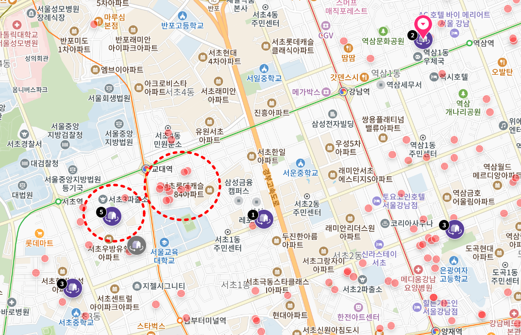 PC로 들어가봤는데, 그냥 등록되어만 있는 곳이 많고 VR로 볼 수 있는 곳은 제한적인 듯 했다. 아래 사진으로 보면 이렇게 보라색 아이콘이 표시된 곳은 룸투어가 가능하고, 빨간 동그라미가 자그맣게 찍혀져 있는 부분들은 그냥 주소와 전화번호가 있다.