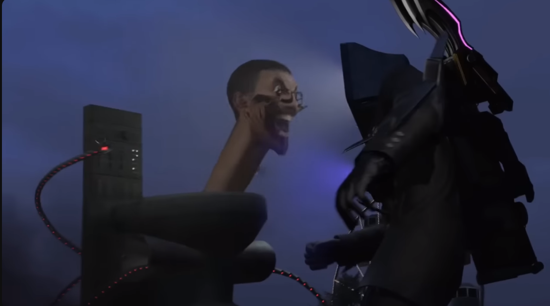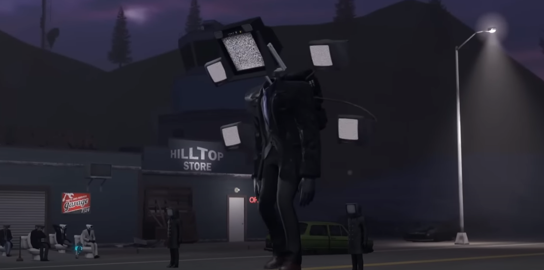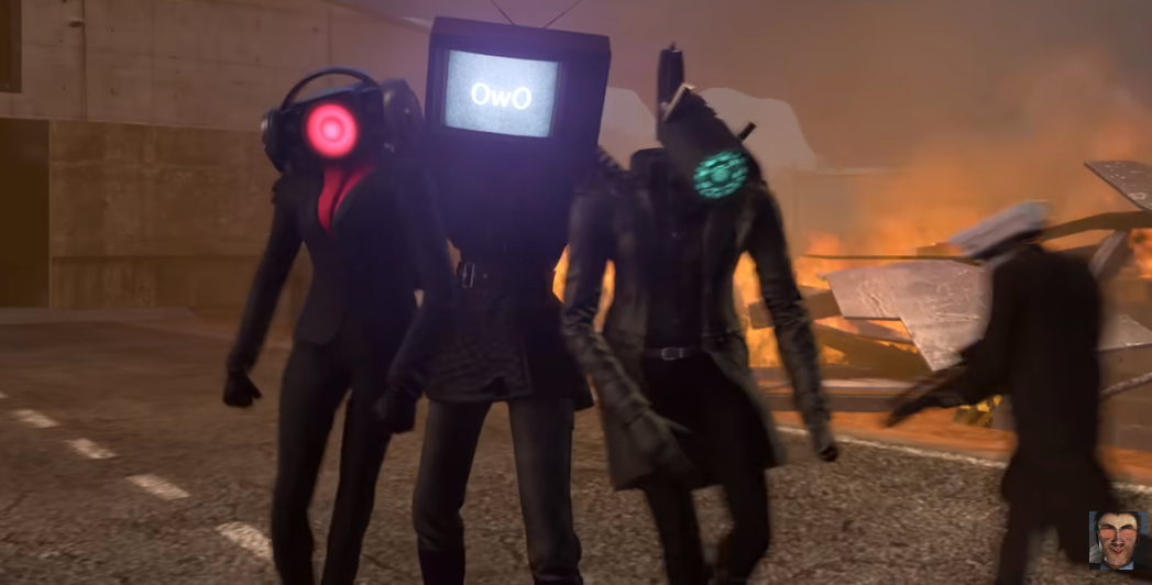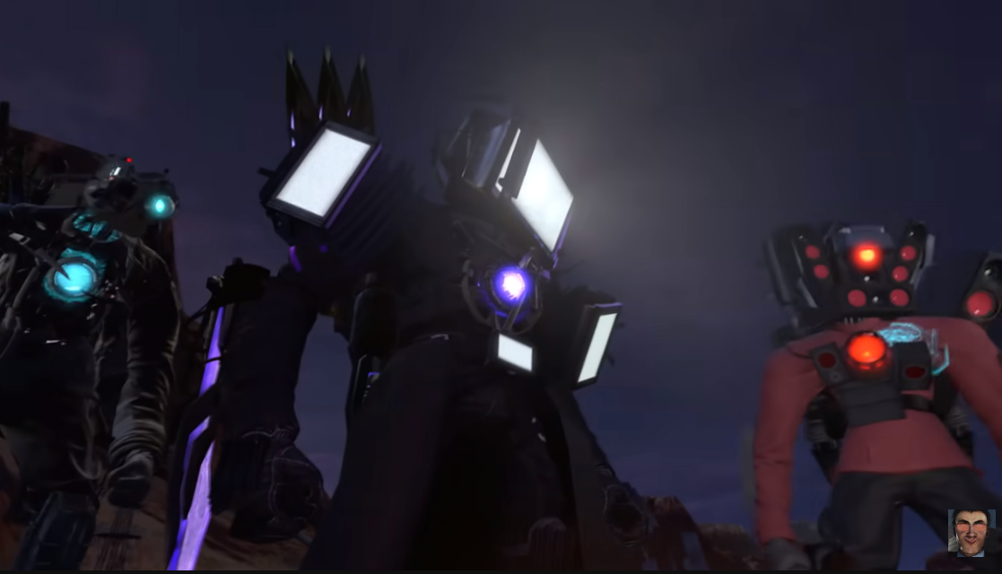 이 기괴하게 생긴 등장인물은 스키비디 토일렛이며, 연합군(카메라멘, 스피커맨, TV맨)이 있고, 의문의 요원들이 있습니다.