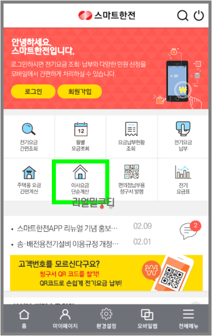 스마트 한전 어플 이용 -> 메뉴에서 민원신청/결과 -> 이사 요금 단순 계산 클릭 -> 고객번호 10자리와 계량기 지침 정보를 입력하면 정산이 가능합니다.