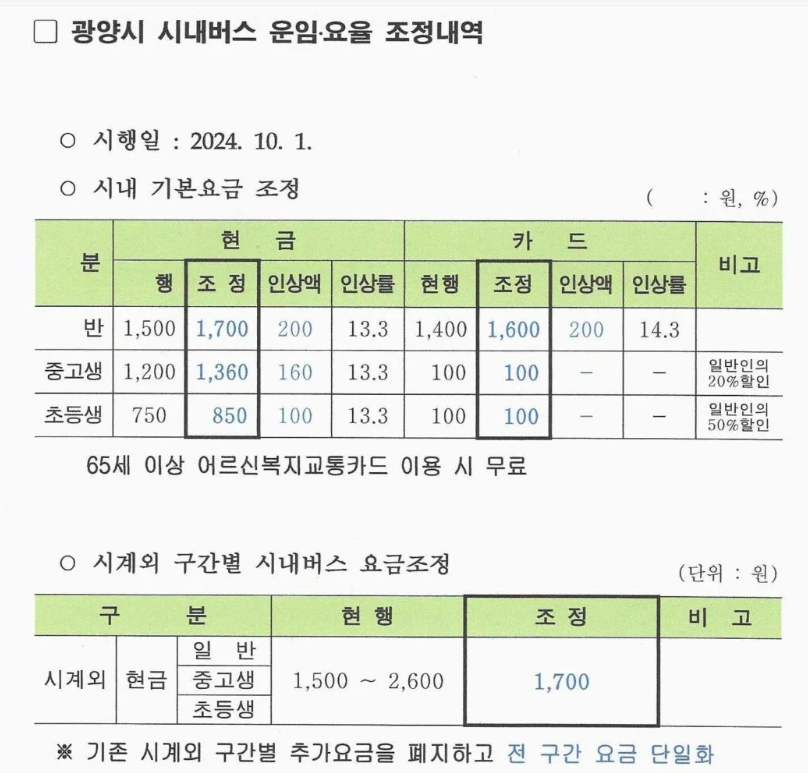 - 초등학생 요금: 현금 850원(100원 인상), 교통카드 동일(100원 할인)