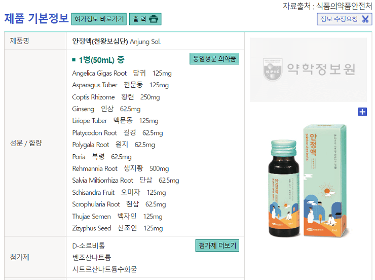 아래는 삼진제약 천왕보심단-안정액의 제품성분입니다. 출처는 약학정보원/식약처입니다.