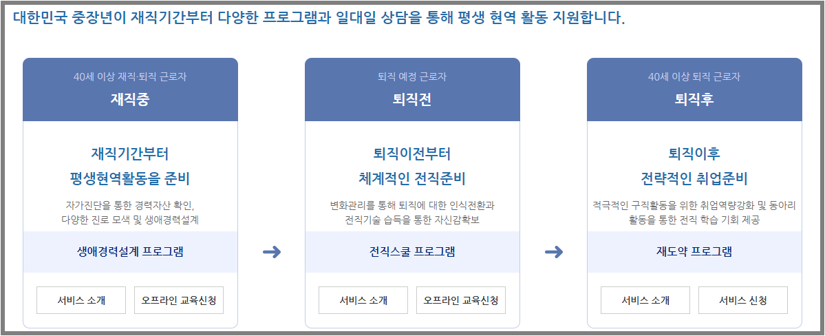 만 40세 이상의 중장년을 대상으로 재직중/퇴진전/퇴직후의 근로단계에 맞춘 전직 및 취업지원 서비스 및 프로그램 등을 무료로 지원하고 있습니다.
